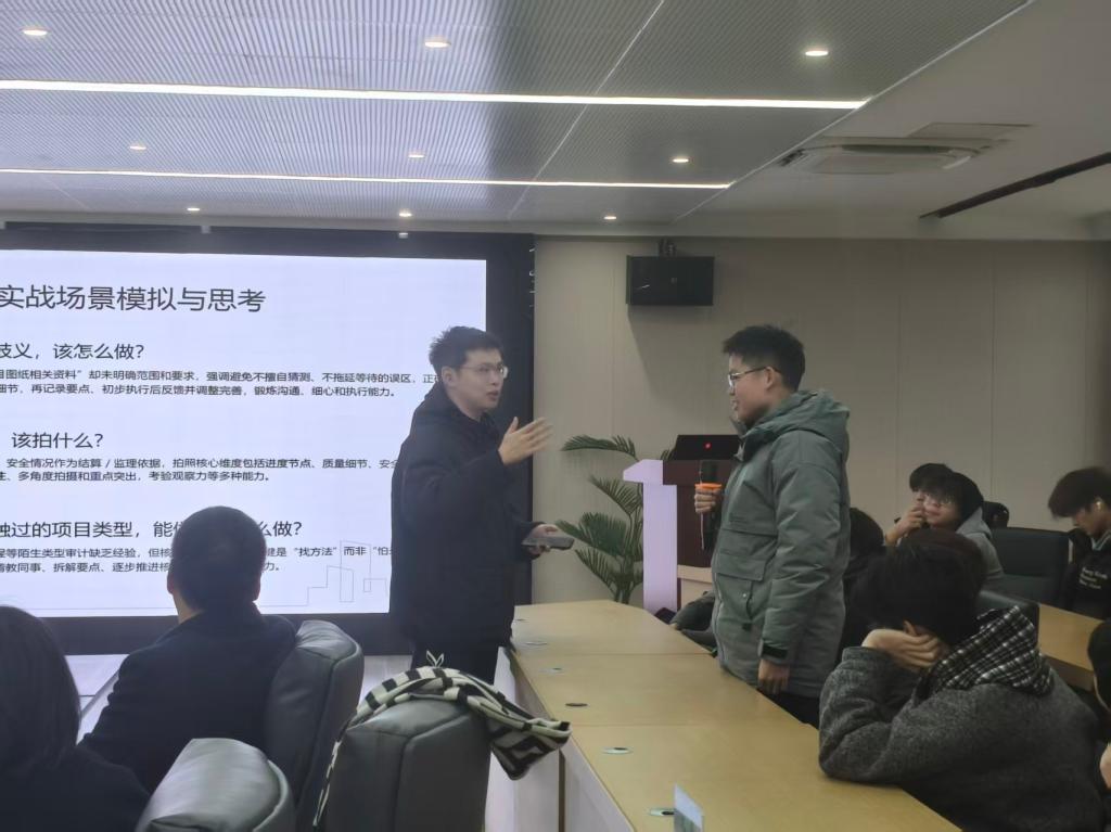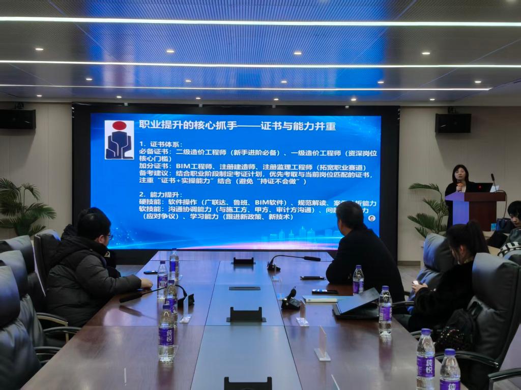在职业发展经历分享环节,技术骨干王圳、李实浩结合自身从职场新人到项目核心的成长历程,分享了在房建、市政等领域造价工作中的实战经验与感悟,用鲜活案例解答了学子关于职业选择、瓶颈突破的困惑,引发热烈共鸣。
