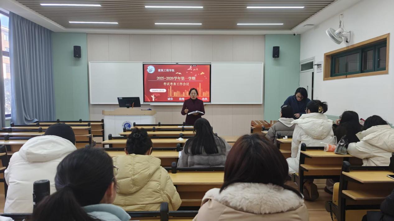 为全面部署本学期期末考试相关工作,严肃考风考纪,规范考试管理,确保期末各项考务工作平稳、有序、公正进行,建筑工程学院于2026年1月8日下午,在1号教学楼1112教室组织召开期末考务工作专题培训会议。学院全体教职工参加会议。本次培训会由学院副院长杨琼主持,学院书记陈敏洁出席会议并讲话。