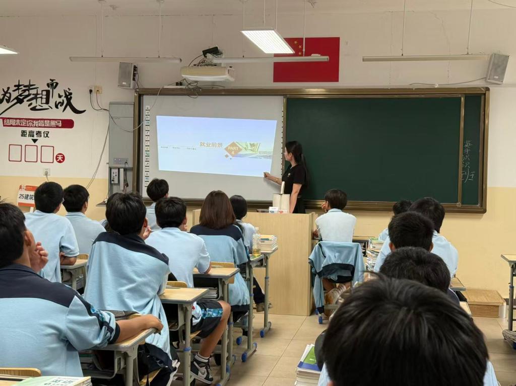 与此同时,专业教师杨蕊老师前往安吉县上墅私立职业高级中学,为该校2025级新生带来了一场兼具专业性与趣味性的宣讲。杨老师围绕“从校园到职场:工程造价师的成长之路”展开分享,通过剖析工程造价岗位的实际工作场景、技能需求及职业发展晋升通道,帮助新生建立起“专业学习与职业发展”的关联认知。现场互动环节中,杨老师耐心解答了新生关于“如何学好专业基础课”、“未来可从事哪些岗位”等疑问,用亲切的沟通风格拉近与新生的距离,进一步激发了他们对工程造价专业的学习兴趣。