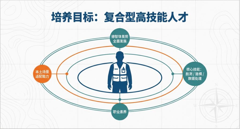 测、三维建模、测绘数据处理等核心技能,兼具本土场景适配能力与职业素养的复合型高技能人才。