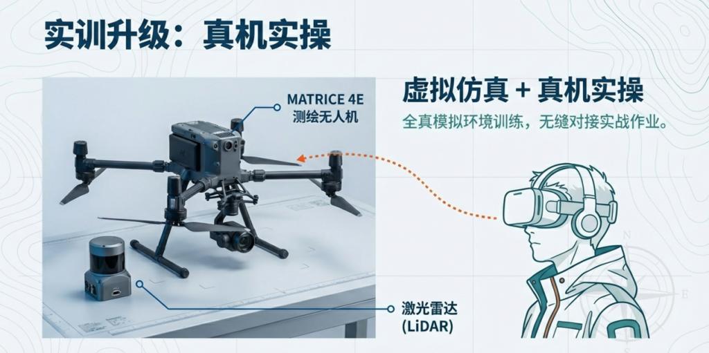 实训升级:虚拟仿真+真机实操,配备MATRICE 4E测绘无人机、激光雷达等先进设备。